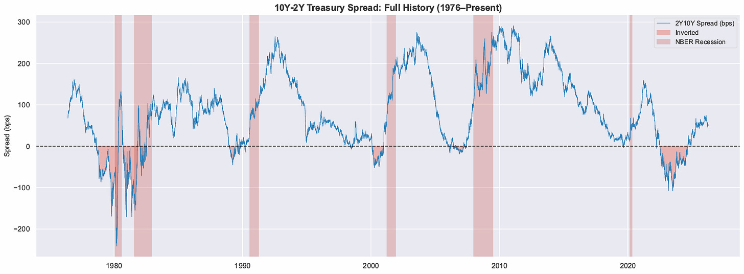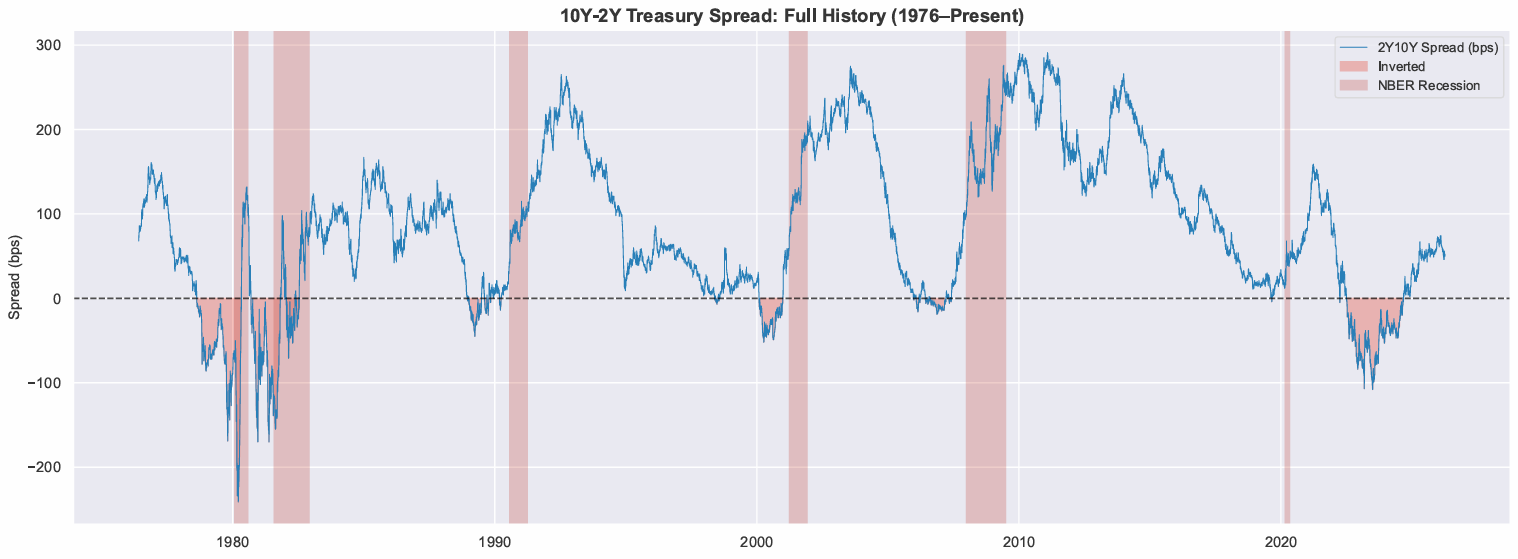 The 2Y10Y yield curve — the spread between 10-year and 2-year Treasury yields — is the most-watched recession indicator in finance. Every major U.S. recession since 1976 has been preceded by an inversion. The conventional wisdom is that a recession follows 12–18 months after inversion ends.9.7 month median.