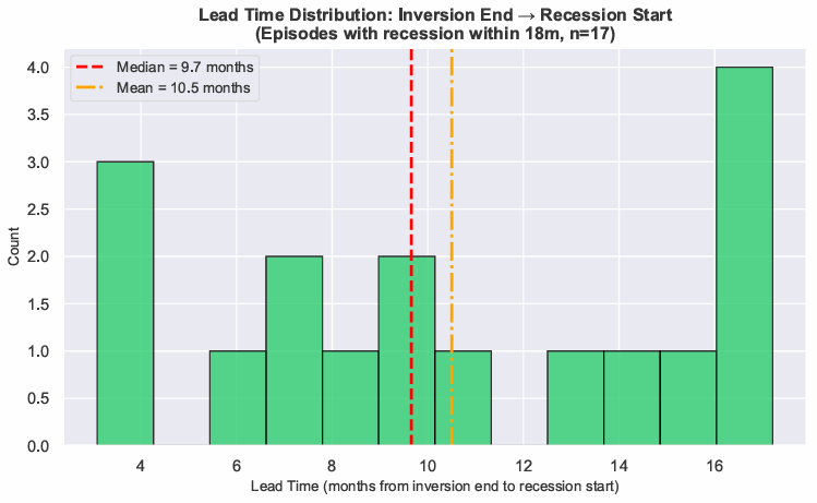 The historical median lead time from inversion end to recession start is 9.7 months — that window passed in June 2025. The P90 upper bound was January 2026. Both have passed without a recession.