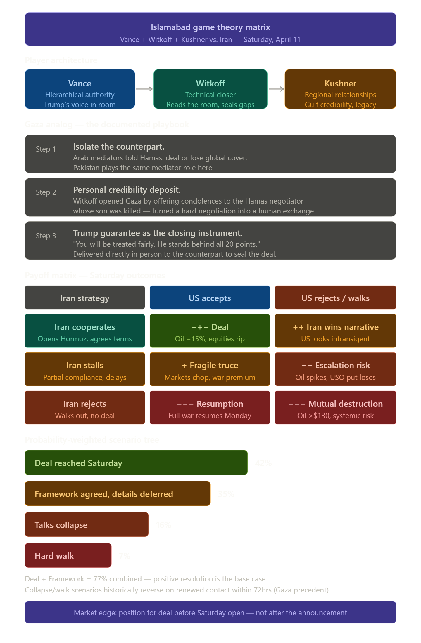 4/11 - Saturday morning in Islamabad, JD Vance, Steve Witkoff, and Jared Kushner are set to sit down with Iranian negotiators. Two weeks of ceasefire. One shot at a deal.