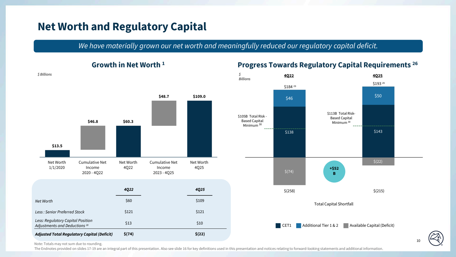 That sentence is doing a lot of work. The shortfall is not an operating insolvency. It’s a structural accounting artifact. The senior preferred stock owed to Treasury doesn’t qualify as regulatory capital under the ERCF framework — so on paper, the capital gap looks enormous. In reality, any PSPA restructuring that converts, cancels, or reclassifies that Treasury preferred could eliminate the shortfall essentially overnight.