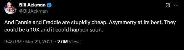 Last night, Bill Ackman — who holds roughly 10% of Fannie Mae and Freddie Mac’s public float through Pershing Square — posted nine words that set financial Twitter on fire: