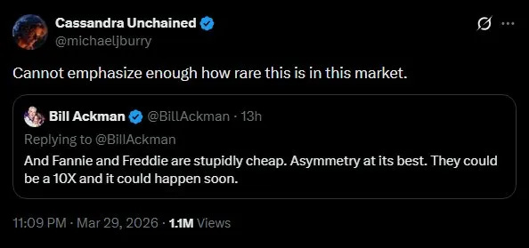 “And Fannie and Freddie are stupidly cheap. Asymmetry at its best. They could be a 10X and it could happen soon.”