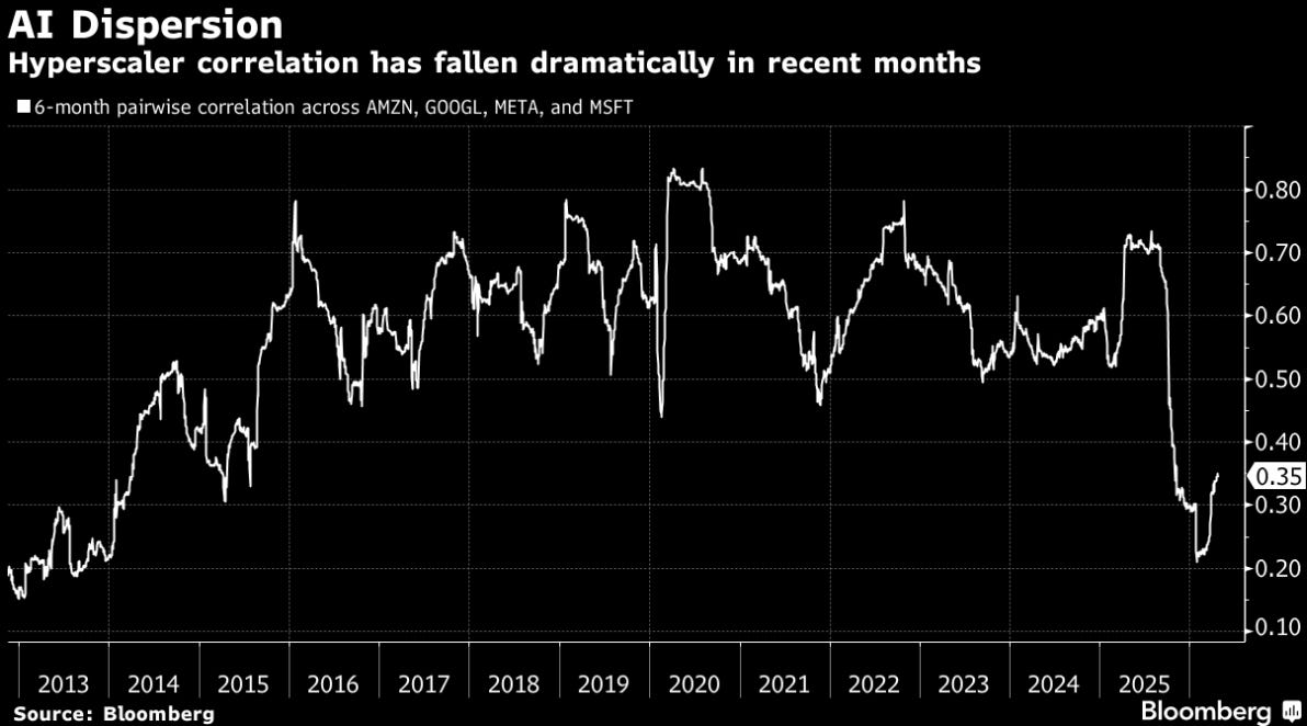 The 6-month pairwise correlation across AMZN 0.00%↑/GOOGL 0.00%↑/META 0.00%↑/MSFT 0.00%↑ has collapsed to ~0.20–0.35, the lowest since at least 2013. This is one of the most important structural signals in the chart deck. The “AI basket” trade is dead as a monolith. The market is now doing fundamental differentiation — pricing MSFT’s Azure growth differently from GOOGL’s search disruption risk, etc.