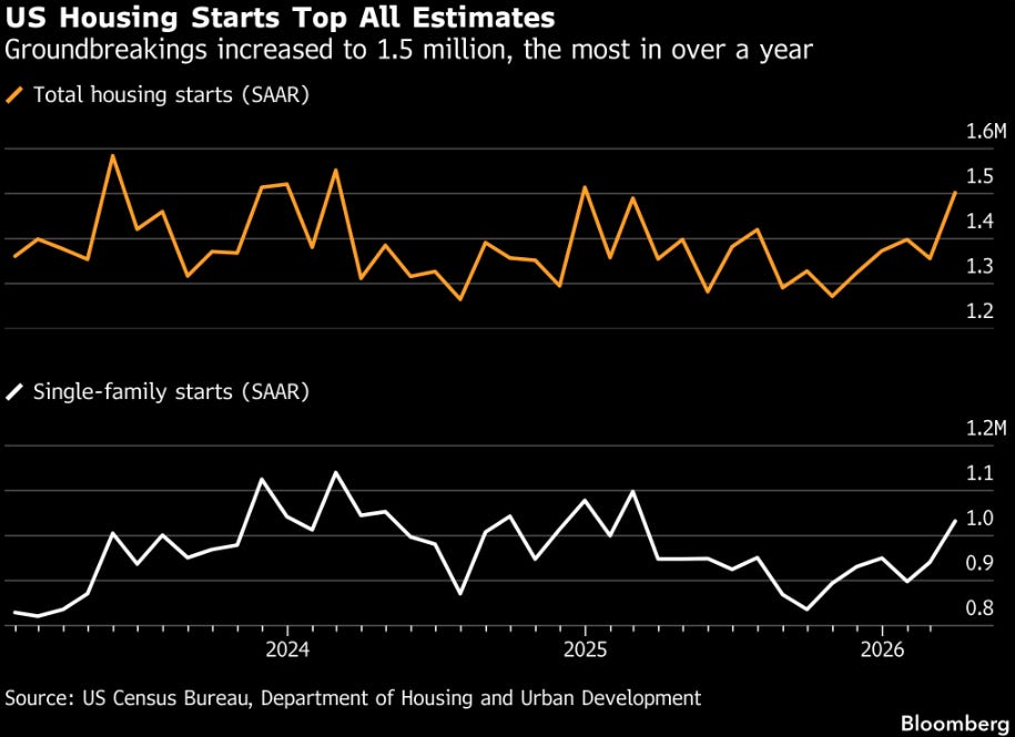 Total housing starts hit 1.5M SAAR — the best in over a year, with single-family at ~1.0M. This is a genuine beat and signals that builders are getting ahead of expected tariff-driven lumber/materials cost increases.