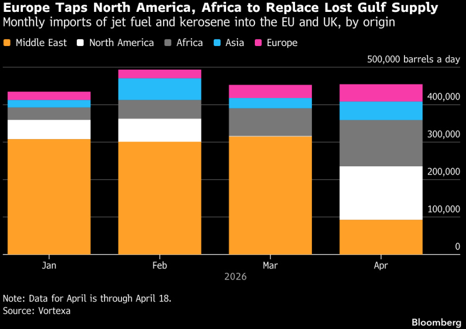 European jet fuel/kerosene imports show Middle East supply cratering in April (barely ~100K bbl/day vs. 300K+ earlier) with North America filling the gap at ~200K bbl/day. This is almost certainly Iran sanctions/Hormuz disruption driven. Another win for the US and the Trump Admin.