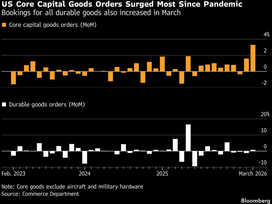 March 2026 core capital goods orders (ex-aircraft, ex-military) surged ~3.5% MoM — the biggest print since COVID. This looks bullish on the surface, but context matters: this likely reflects front-loading ahead of tariffs, not genuine organic demand expansion.