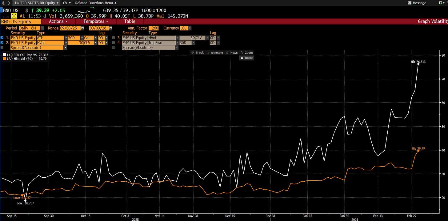 I sold my BNO 0.00%↑ BNO 35 calls Monday morning at +60%. Thought I was being disciplined — locking in gains before the typical geopolitical spike fades.