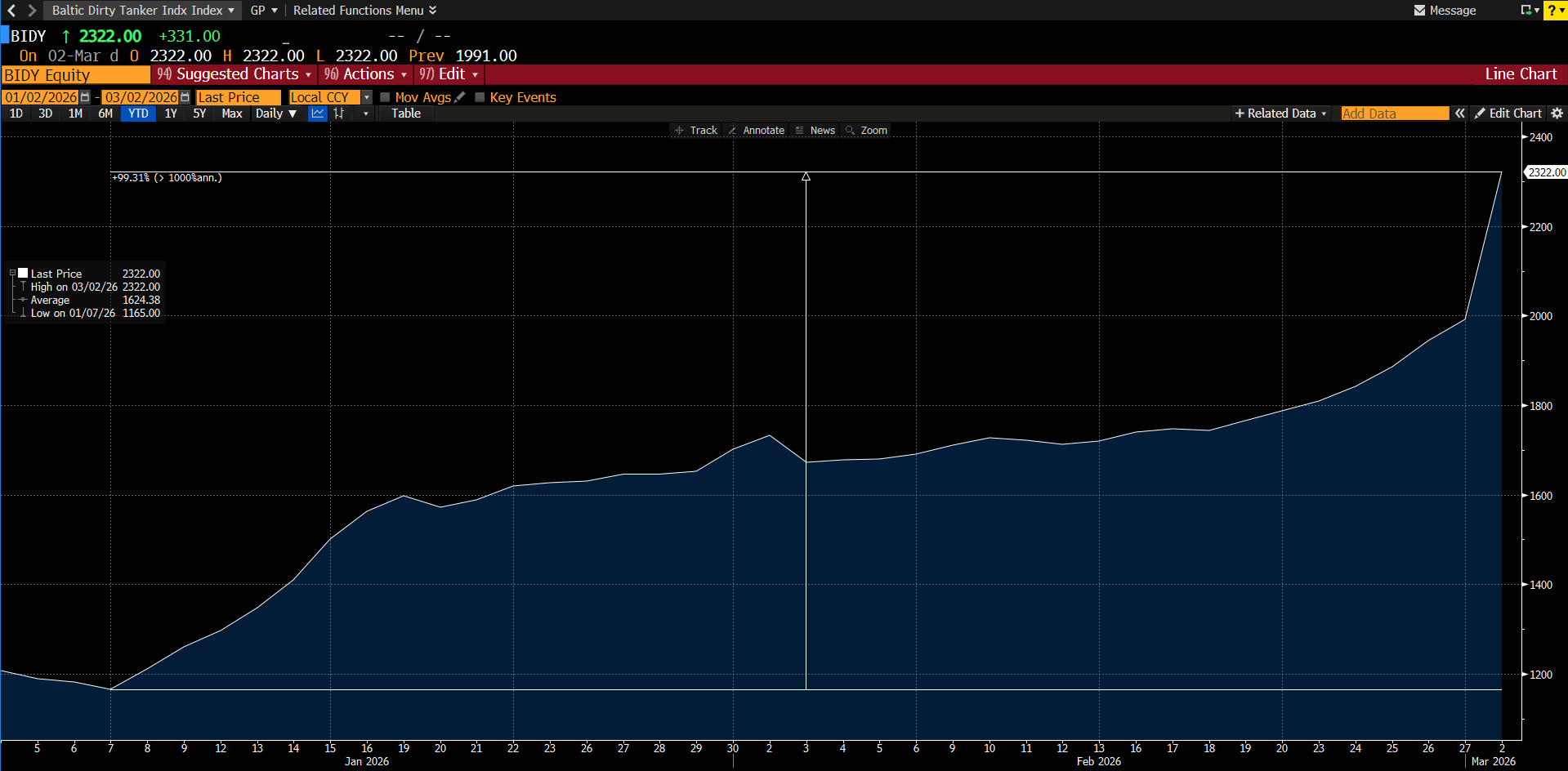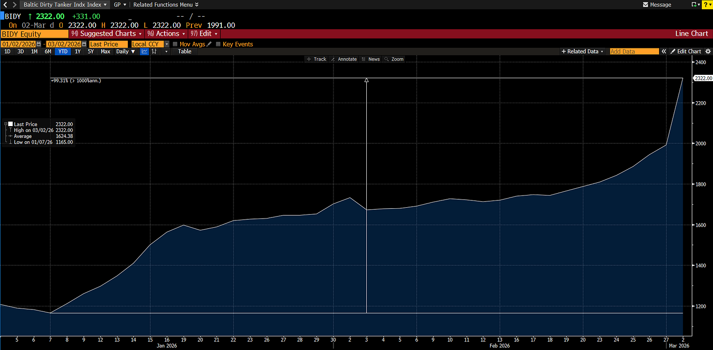 The Baltic Dirty Tanker Index (BIDY) — the rate shipowners charge to move crude — just hit 2322, up +331 points in a single day. That’s a +99% move from January and an all-time high in the data series (YTD).