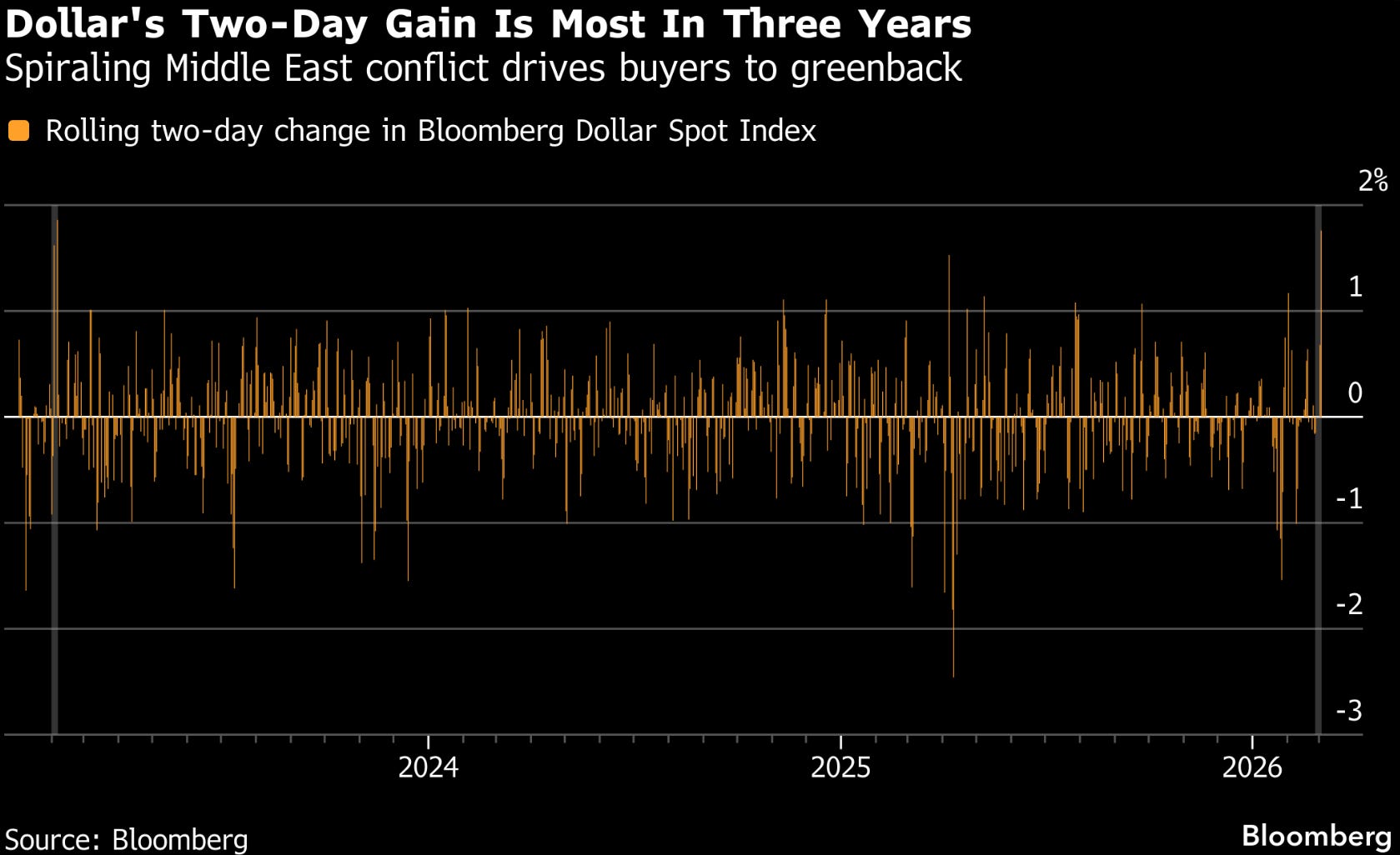 The DXY UUP 0.00%↑ spiked ~2% in two days — the biggest flight-to-safety move in three years. When the dollar, gold, and oil all rally together, that’s risk-off with an inflation premium. That combination destroys multiple expansion.