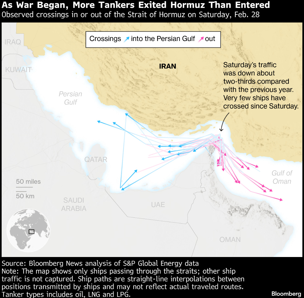 Tuesday, March 3: Qatar halts ALL LNG production after Iranian strikes on operating facilities. Gulf refineries sustain damage. Tanker traffic still at zero.