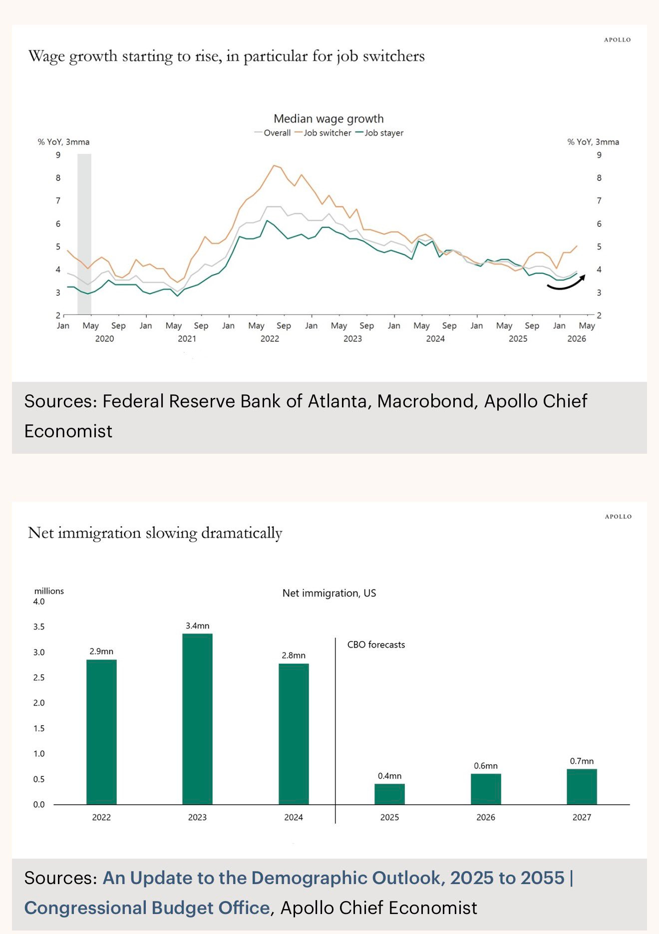 Chart one: median wage growth is bending back up. After cooling from the post-COVID peak, the job-switcher series — historically the leading indicator for broader wage moves — is re-accelerating into early 2026. Chart two: net immigration has collapsed from 2.8 million in 2024 to a CBO-projected 0.4 million in 2025, recovering only modestly to 0.6–0.7 million through 2027.