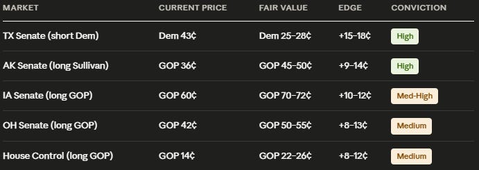 More importantly: Alaska at 64% Democrat in the current political environment is simply wrong on priors alone. I have Sullivan at 45–50 cents fair value. That’s a 9–14 cent edge on the highest-volume individual Senate race on the page ($306K).