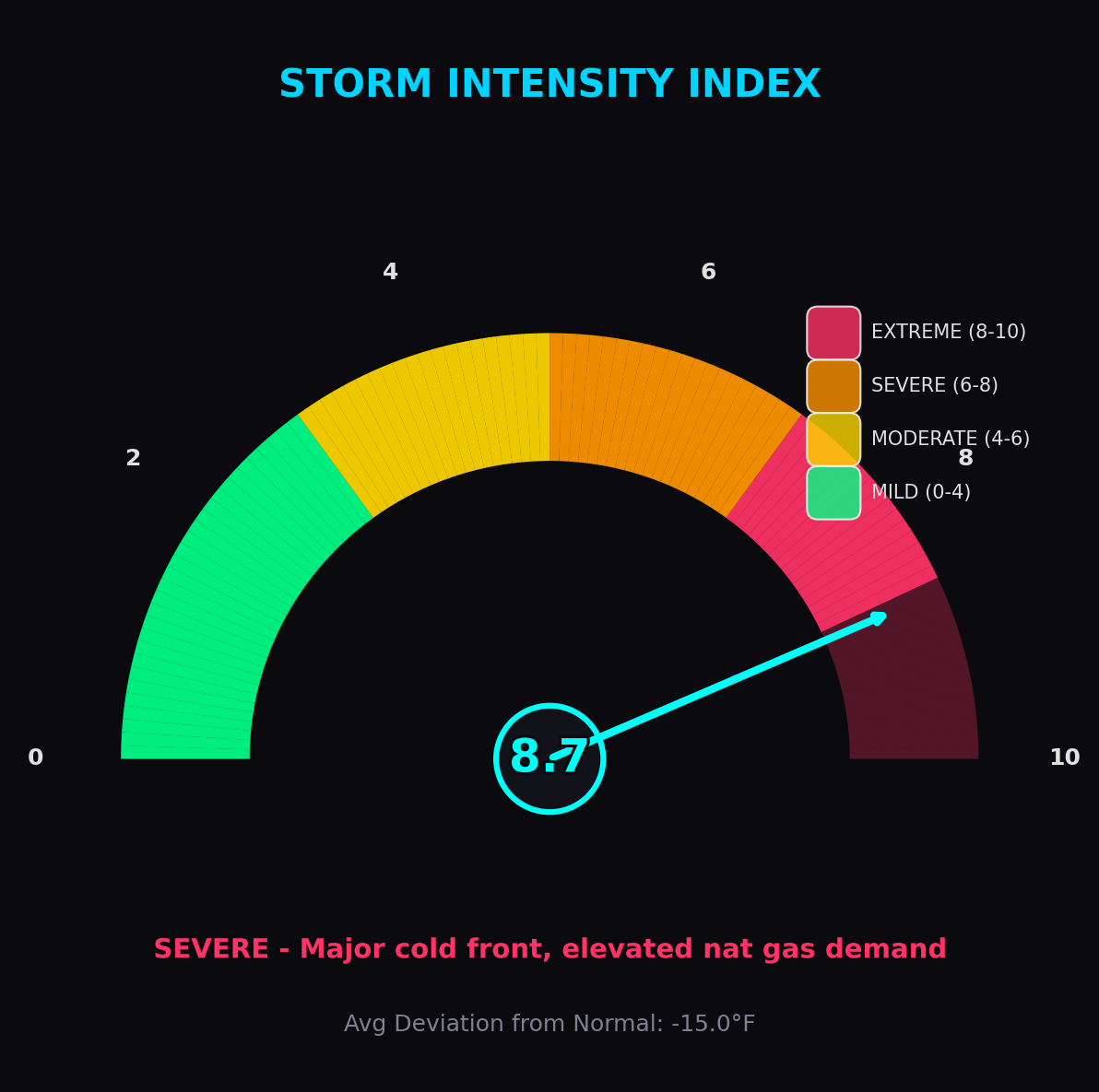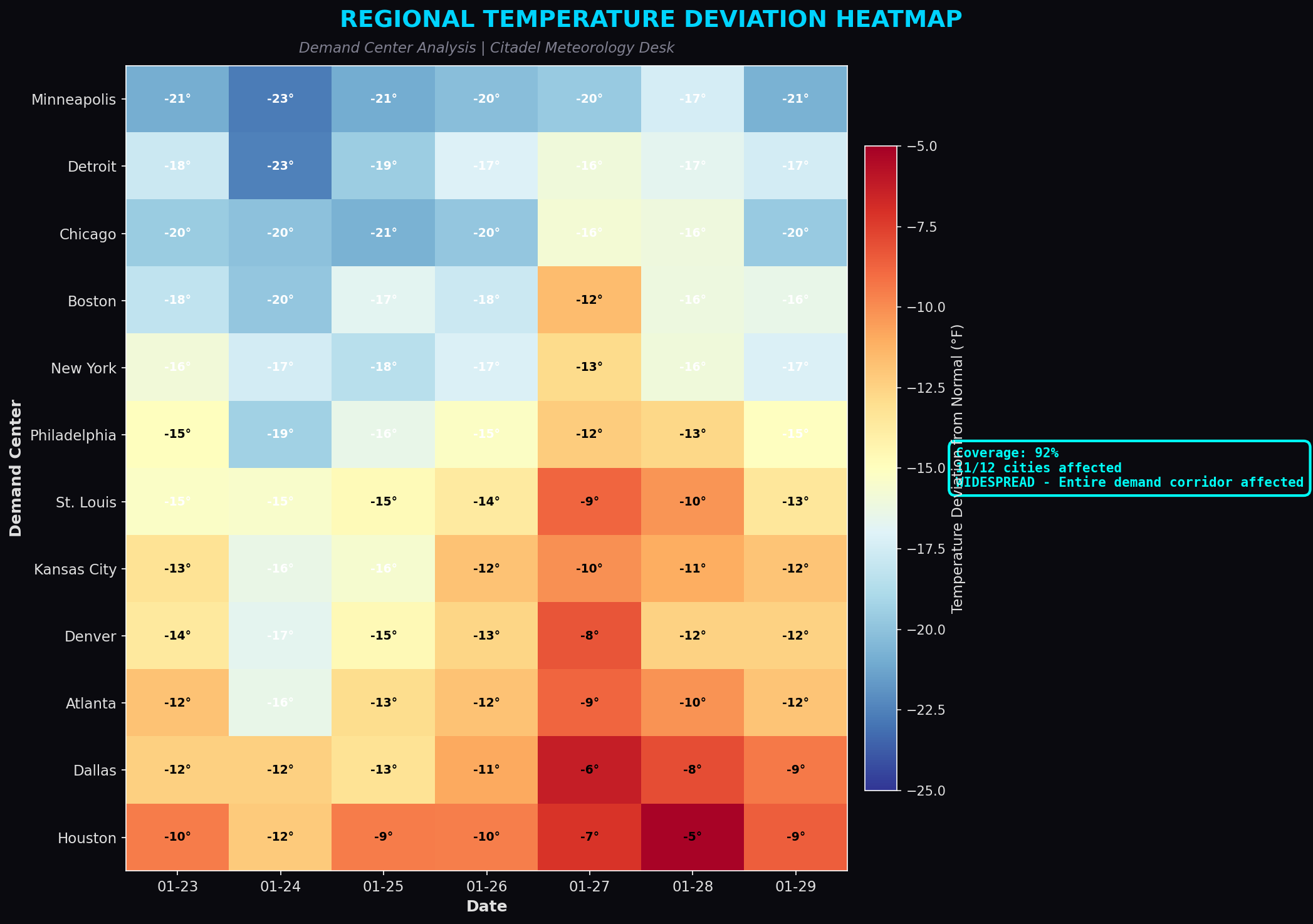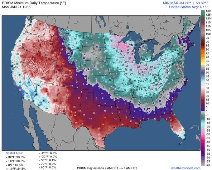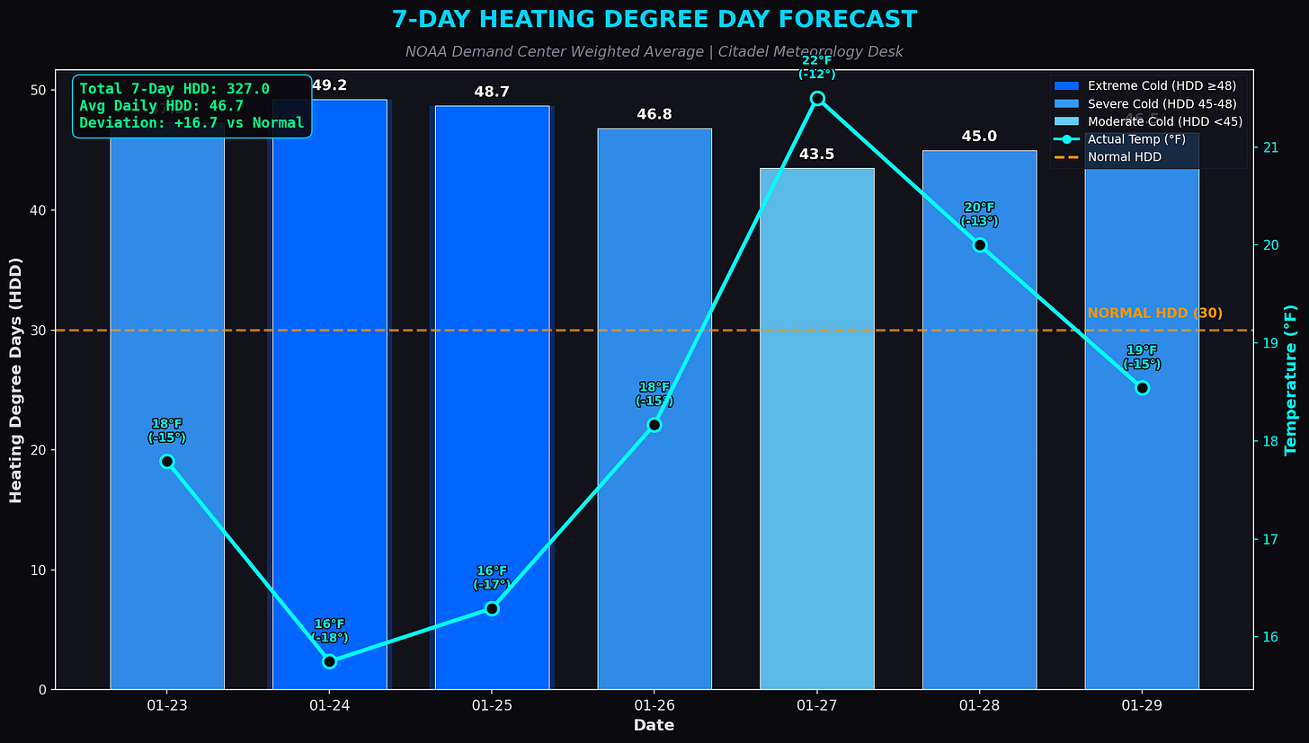 Natural gas futures had already spiked +44% in a week—from $9.95 to $14.36—as traders priced in massive heating demand. The entire central corridor of the US was about to experience sub-zero temperatures, with some areas hitting -34°F.