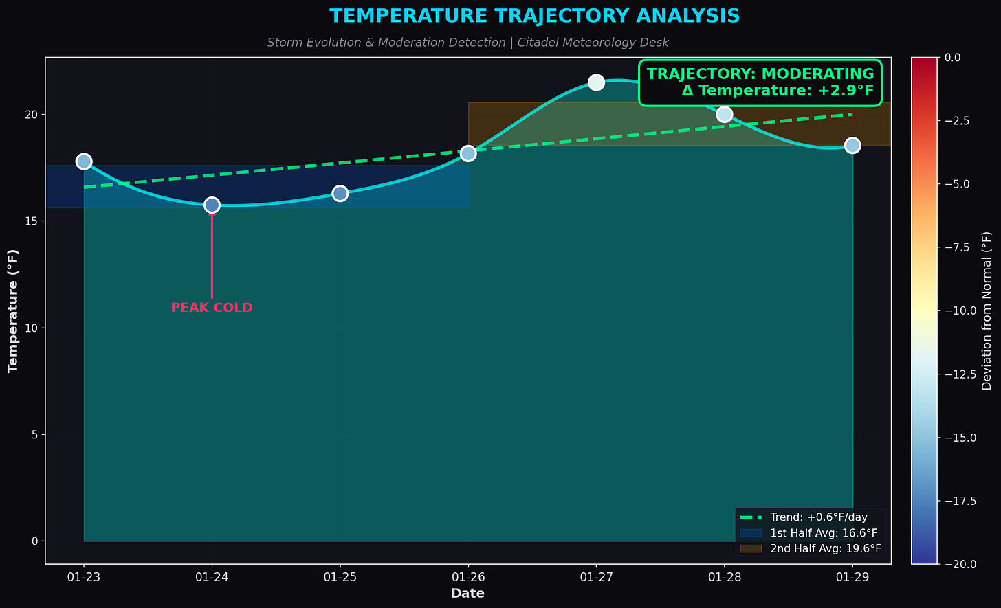 Critical insight: Peak cold was Jan 24-27, with moderation starting immediately after. The storm had a shelf life, and the market wasn’t pricing it.